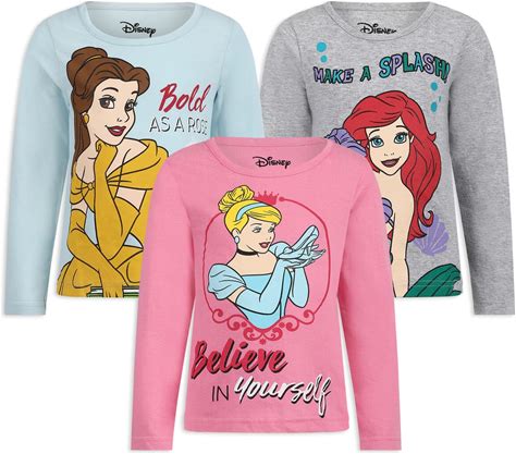 Disney Princess Cinderella, Belle, And Ariel Girls 3 Pack Long Sleeve Shirt For Toddler And Big Kids