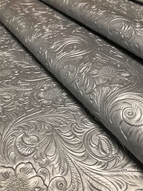 Tooled Faux Leather Western Cowboy, Floral Embossed Vinyl, Craft DIY And Upholstery Pleather Fabric - Cut By The Yard (Silver)