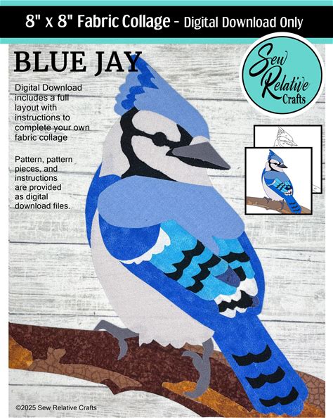 BLUE JAY Fabric Collage Pattern, Raw Edge Applique, Art Quilt