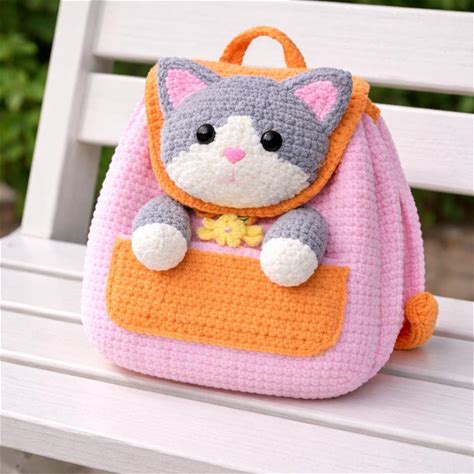 Cat Backpack Crochet Pattern Cute Kids School Bag 3D Cat Flap Backpack Begginer Friendly Pdf