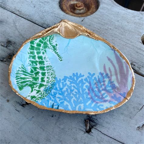 Mermaid Decor, Decoupage Shell Art, Decoupage Shells, Seahorse, Beach Decor, Clam Shell, Mermaid Gifts, Ring Dish, Sea Shell Decor, Shells