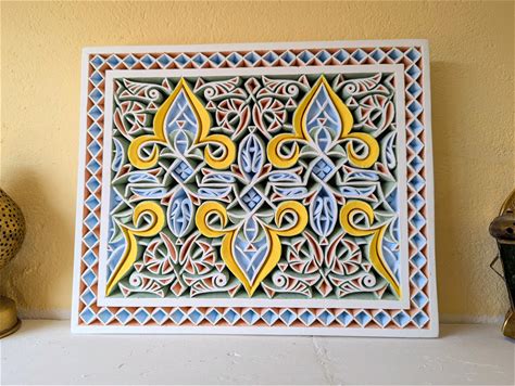 Moroccan Hand Carved Plaster Wall Art: Traditional Islamic Pattern Decoration, Painted Arabesque Design